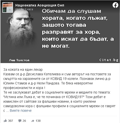 „Познавах лично д-р Юлиян Стамов и д-р Нели Пандова. Те бяха невероятни професионалисти и хора! Те не заслужават дебат в социалните мрежи и медиите по темата: „Истина или Лъжа е, че те починаха от КОВИД-19?“ Този дебат е измислен от сайтове за фалшиви новини, в които ухилени самодоволни хора с фалшиви профили в социалните мрежи се гаврят с паметта на колегите ми. Махнете си мръсните ръце от паметта на тези чисти хора. Намерете си друга плячка“, посочва тя.