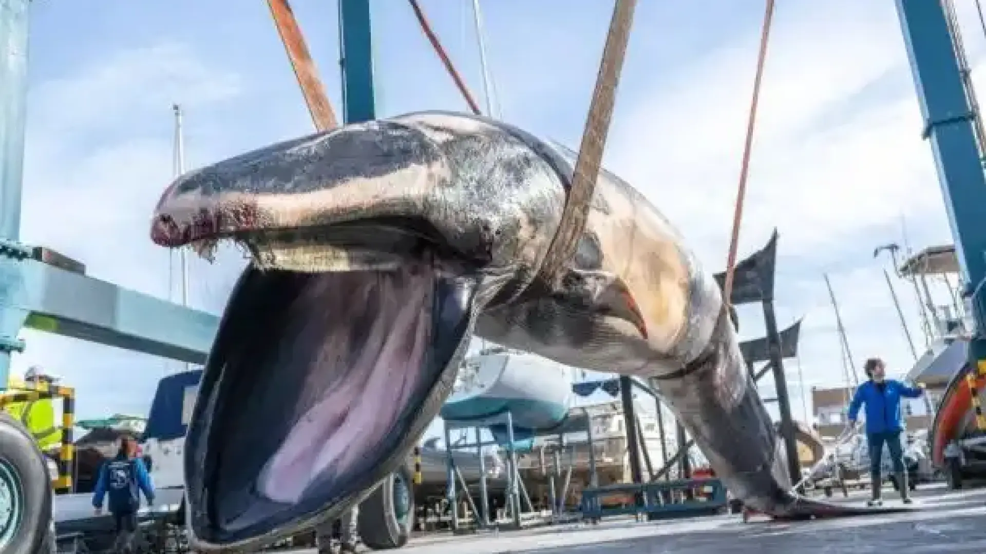 Животното беше теглено до ръба на водата с лодки, където кран беше използван, за да повдигне едрия бозайник на сушата.