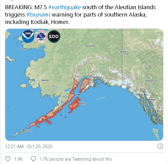Американският център за предупреждение за цунами заяви, че трусът, за който първоначално беше съобщено, че е с магнитуд 7,4, е предизвикал издаването на предупреждение за цунами за Санд Пойнт, Колд Бей и Кодиак, които са рядко населени.