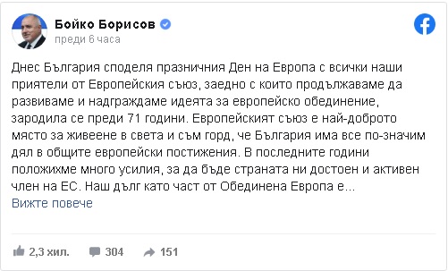 Това написа в личния си профил във Facebook премиерът в оставка Бойко Борисов по повод днешния Ден на Европа.