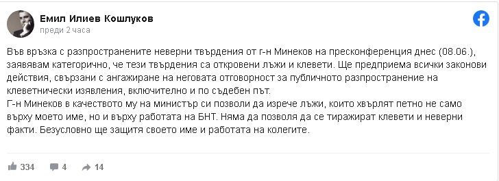 „Във връзка с разпространените неверни твърдения от г-н Минеков на пресконференция днес (08.06.), заявявам категорично, че тези твърдения са откровени лъжи и клевети.