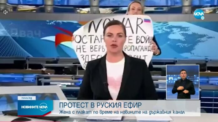 Припомняме, че предната вечер журналистката прекъсна основната новинарска програма на държавния руски „Първи канал„, като се появи зад водещия в студиото с плакат с лозунги, осъждащи войната.