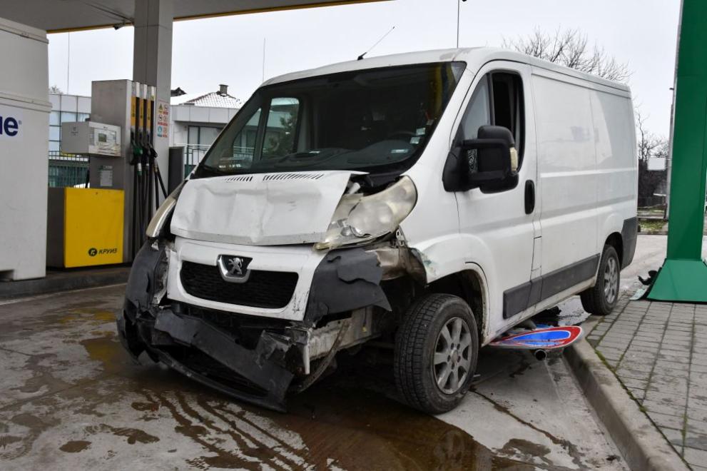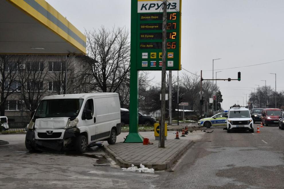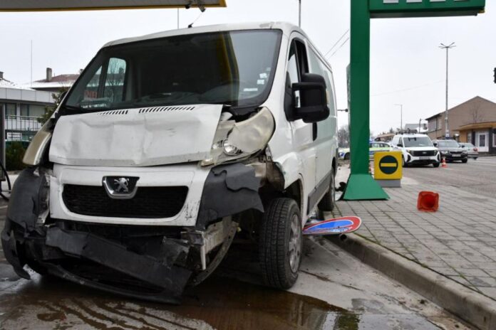 Тежък пътен инцидент на оживения булевард „Освобождение“ в Хасково – микробус удари фирмен автомобил, помете пътни знаци и се вряза в района на близката бензиностанция на метри от колонките, съобщи местният сайт haskovo.info.